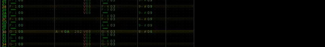 J’ai donc placé plus d’effets que d’habitude, à commencer par le « Sxx ». Je ne sais pas si c’est possible de le faire sur DefleMask, mais je me souviens d’en avoir abusé sur LSDj avec la commande K02. Ca permet de rendre un canal muet après un certain nombre de ticks – c’est plus pointu que le « cut ». J’ai aussi utilisé le V sur les canaux en square, ce qui permet de changer le signal carré. Bon, si je parle trop technique, on ne va pas s’en sortir.